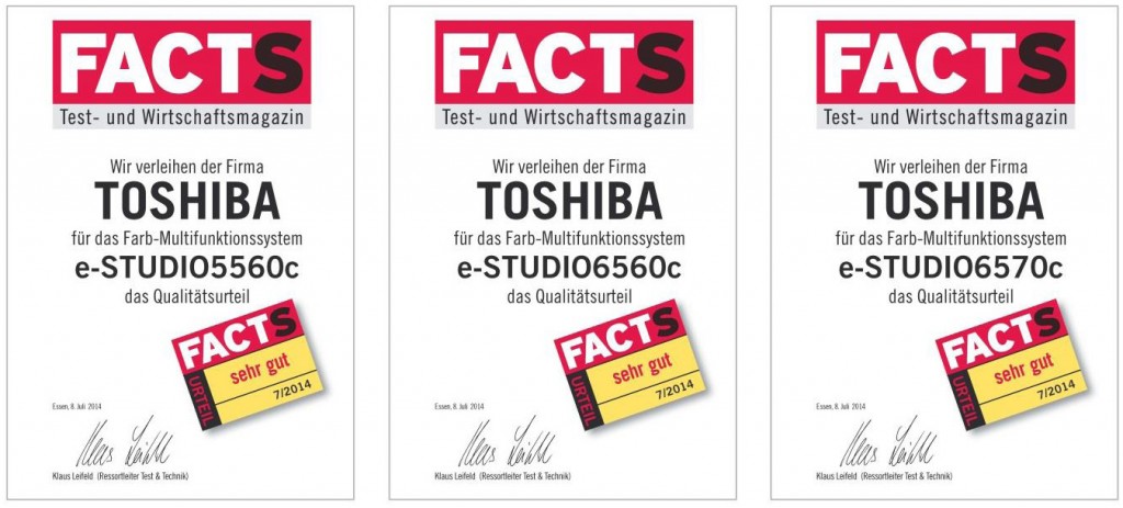 V laboratoriju nemške poslovne revije FACTS so preizkušali Toshiba A3 barvne sisteme e-STUDIO5560c, e-STUDIO6560c in e-STUDIO6570c s poudarkom na produktivnosti, kakovosti, funkcionalnosti , način uporabe in varnosti.